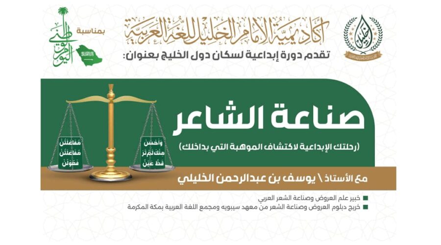 بشرى سارة لهواة الشعر الفصيح ومحبي الانغماس في عالم الشعر أكاديمية الإمام الخليل للغة العربية تقدم برنامجا متميزا بعنوان: دبلوم العروض والقوافي 📜 سوف تتعلم : كيف تقوم بالتحليل العروضي للقصائد؟ كيف تميز بين البحور الشعرية سماعا عن طريق النغمات الجميلة؟ كيف تنظم القصائد على أشهر البحور الشعرية؟ كيف تتجنب من عيوب القافية في قصائدك؟